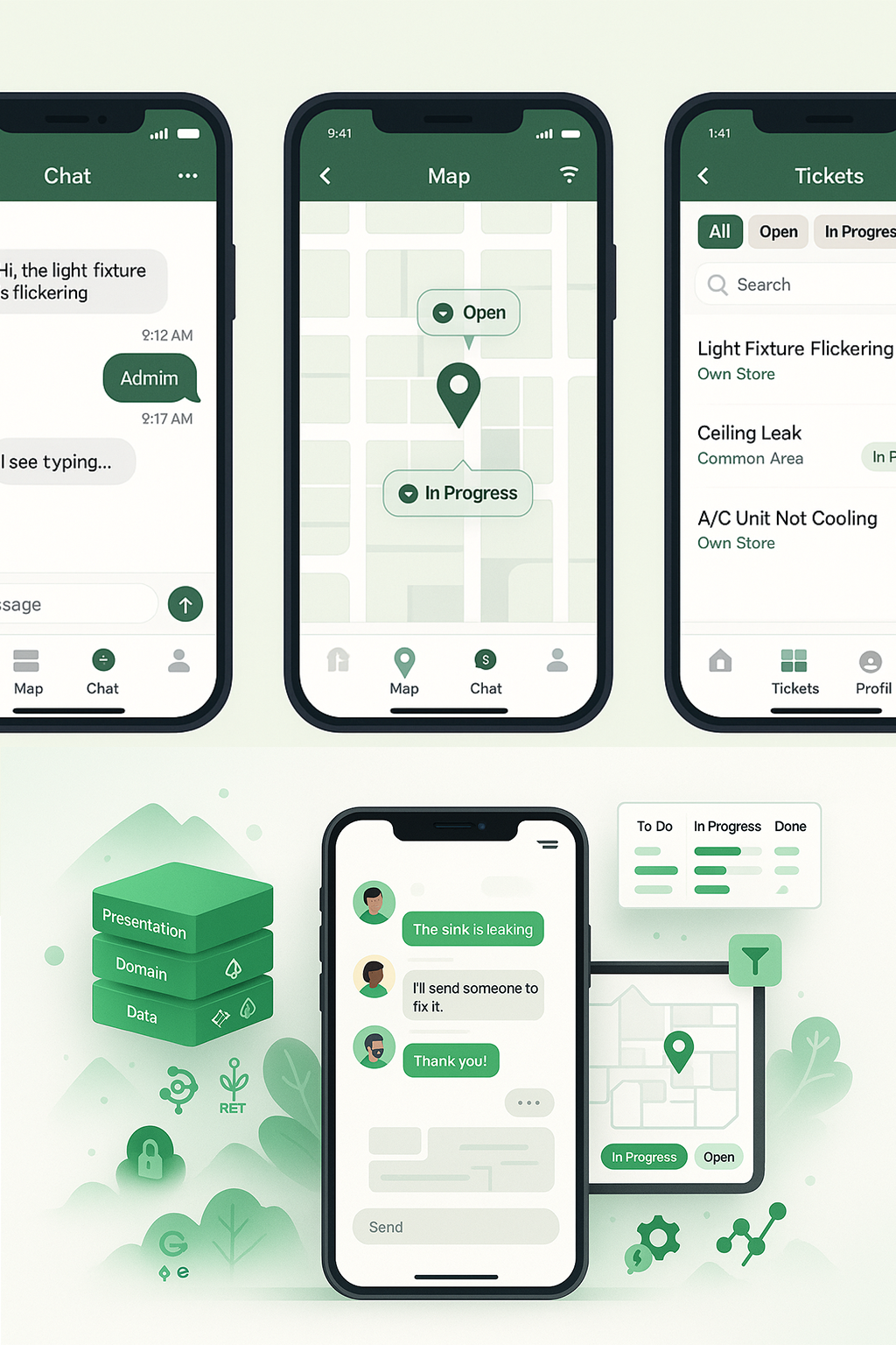 We're building a new mobile Maintenance App designed for shop owners, administrators, and maintenance crews to streamline managing repair requests for both private shop and common areas. Key features include real-time chat between all user groups and an interactive floor map allowing users to precisely pinpoint the location of an issue, describe the problem, and add contextual information like photos or notes. The app is built with a high-fidelity user interface, focusing on responsiveness and smooth navigation using bottom tabs. Its technical foundation is a clean, domain-driven architecture, leveraging Riverpod for state management, Dio and GraphQL for robust data handling, and secure local storage to protect sensitive information.